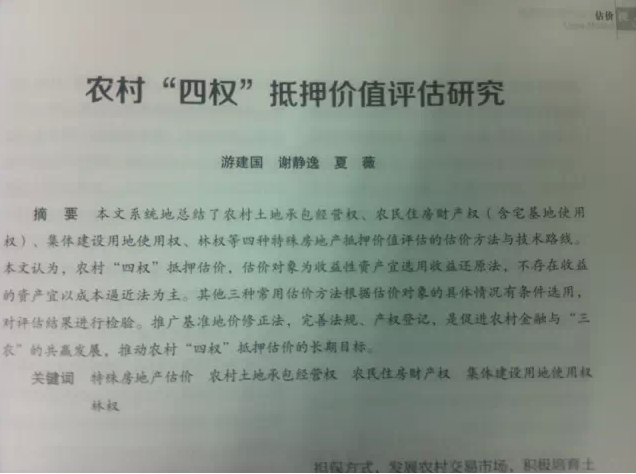 農村“四權”融資中重要的一環就是確定其抵押價值,而抵押價值通常由獨立第三方來進行評估。但農村產權抵押存在著固有的法律瓶頸與制度限制,所以其抵押估價也存在著重大的特殊性。我國農村產權抵押處于起步階段,鉆研解決其抵押估價技術問題,配合政府進一步提升農村金融服務的能力和水平,是評估行業支持“三農”,服務“三農”迫切需要,也是廣大估價師的職業使命。