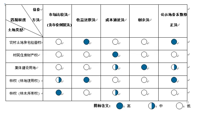 根據《城鎮土地估價規程》(GB/T18508-2014)(農村建設用地地價評估可參照此規程)、《農用地估價規程》(GB/T28406-2012)等估價規范,現行估價常用方法有市場比較法、收益還原法、成本逼近法、剩余法、公示地價系數修正法等。估價方法適用性分析取決于估價目的、待估宗地的特點及當地市場情況等。