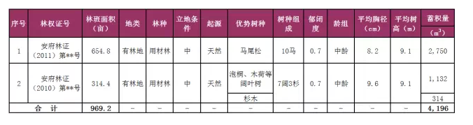 估價對象:江西省贛州市安遠縣969.20畝以馬尾松、杉木、泡桐、木荷等為主的用材林資產和其林地使用權,共涉及兩本林權證,具體情況見下表: