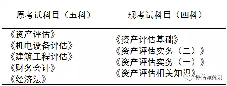 資產評估師職業資格考試科目將原來的《資產評估》、《財務會計》、《經濟法》、《機電設備評估》和《建筑工程評估》5個考試科目,調整為《資產評估基礎》、《資產評估相關知識》、《資產評估實務(一)》和《資產評估實務(二)》4個考試科目。