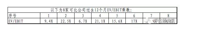 在運用市場法評估分析的過程中,評估人員主要選用過去12 個月的企業(yè)價值/息稅前利潤乘數(shù)(“EV/EBIT”)。這是由于目標(biāo)公司B 從事餐飲連鎖行業(yè),固定資產(chǎn)和折舊攤銷費用相對較小,與可比公司的情況一致。
