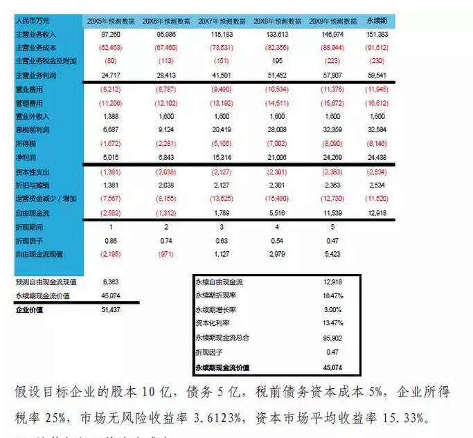 在此基礎(chǔ)上,評估人員進一步考慮貨幣的時間價值、通貨膨脹、以及被評估資產(chǎn)的有關(guān)風(fēng)險,選取了合適的折現(xiàn)率,得到目標(biāo)公司的股權(quán)的公允價值。