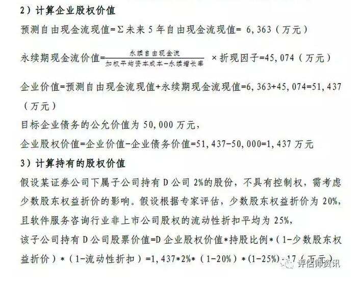 在運用企業(yè)價值倍數(shù)法計算得出目標(biāo)企業(yè)價值,扣減凈負債并對非經(jīng)營性資產(chǎn)和負債以及少數(shù)股東權(quán)益進行調(diào)整得出企業(yè)全部股權(quán)價值后,按照持股比例計算股權(quán)價值,再扣減股權(quán)流動性折扣,得出非上市公司股權(quán)價值。