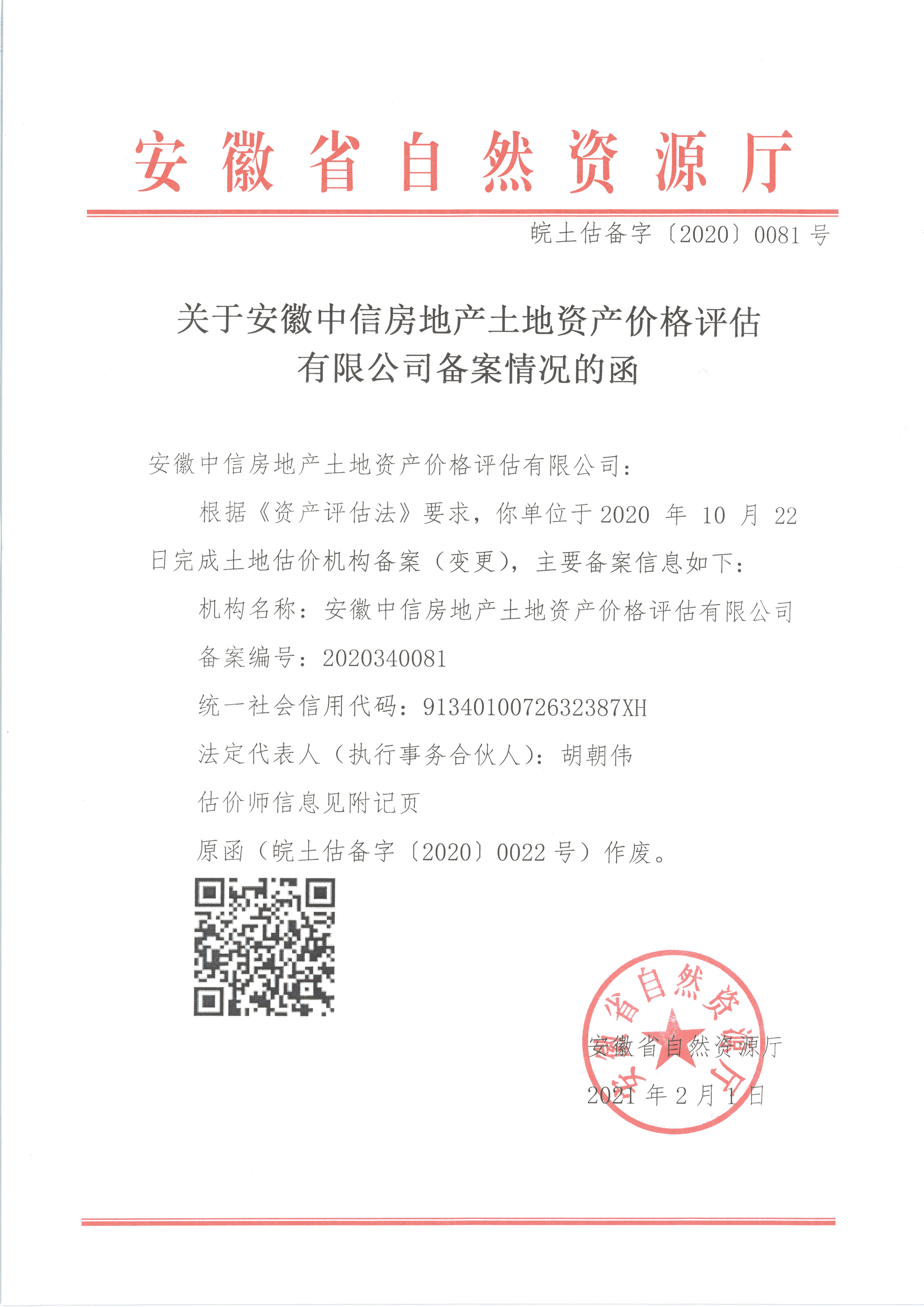 安徽省自然資源廳頒發(fā)的土地評(píng)估機(jī)構(gòu)備案函