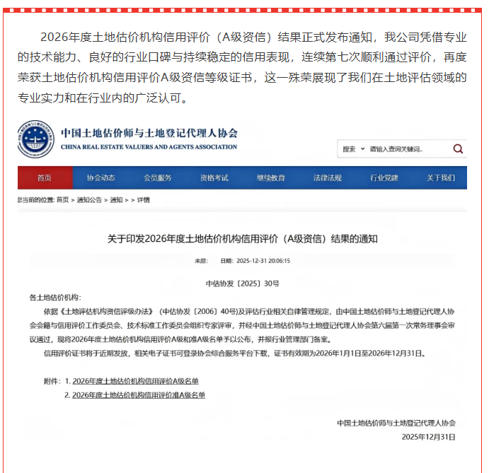 喜報丨我單位榮獲2026年度土地估價機構信用評價 A 級資質榮譽稱號